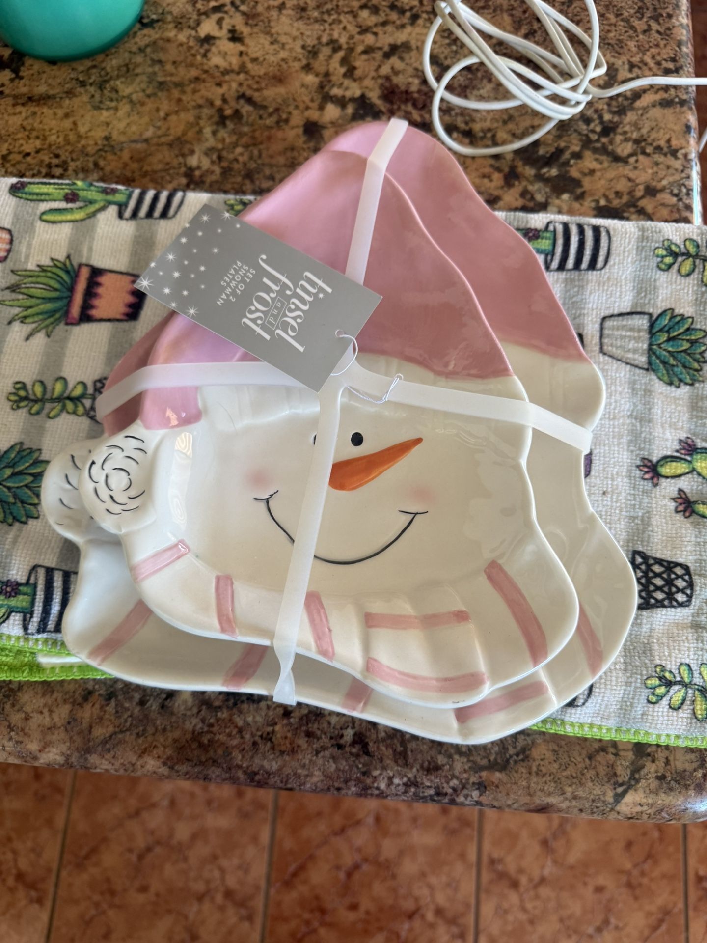 Pink snowman plate set. 1 big plate and 1 small plate.