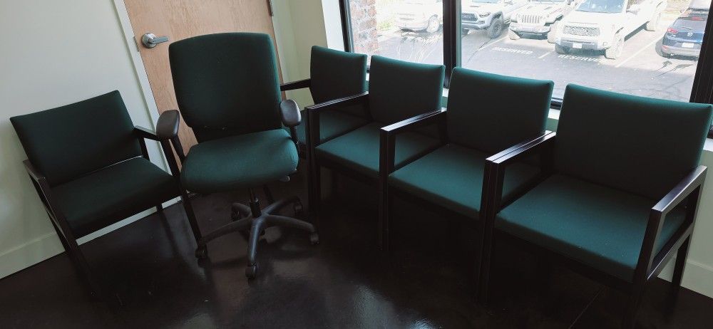 6 Eligant emerald green commercial office chairs. 5 conference chairs 1 desk chair with casters Pristine, like-new condition