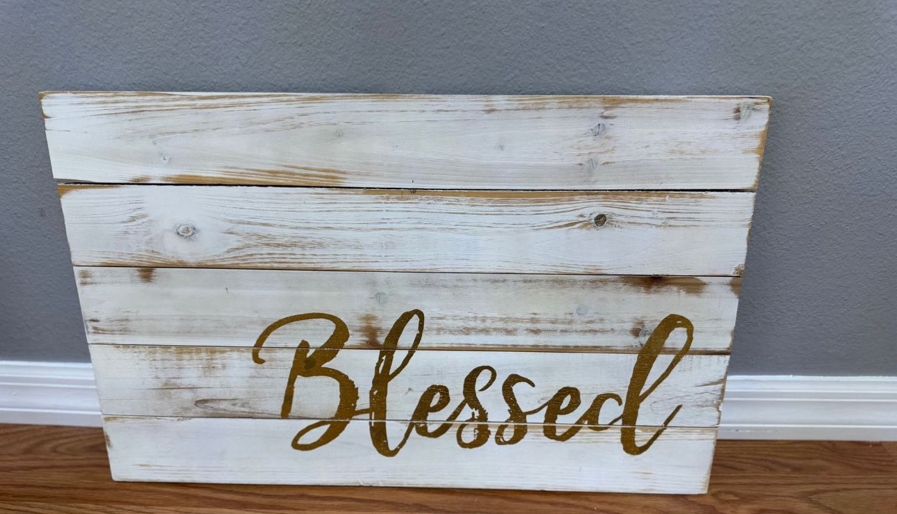 “Blessed” Rustic Wood Sign – $5 Farmhouse-style wooden sign with gold lettering. Great for entryway or shelf display. Must pick up. Serious buyers only.