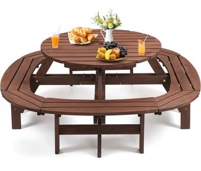 Assembled New Wood Picnic Table for 10-12 People Round Top w/ Umbrella Hole 4 Built-in Curved Benche