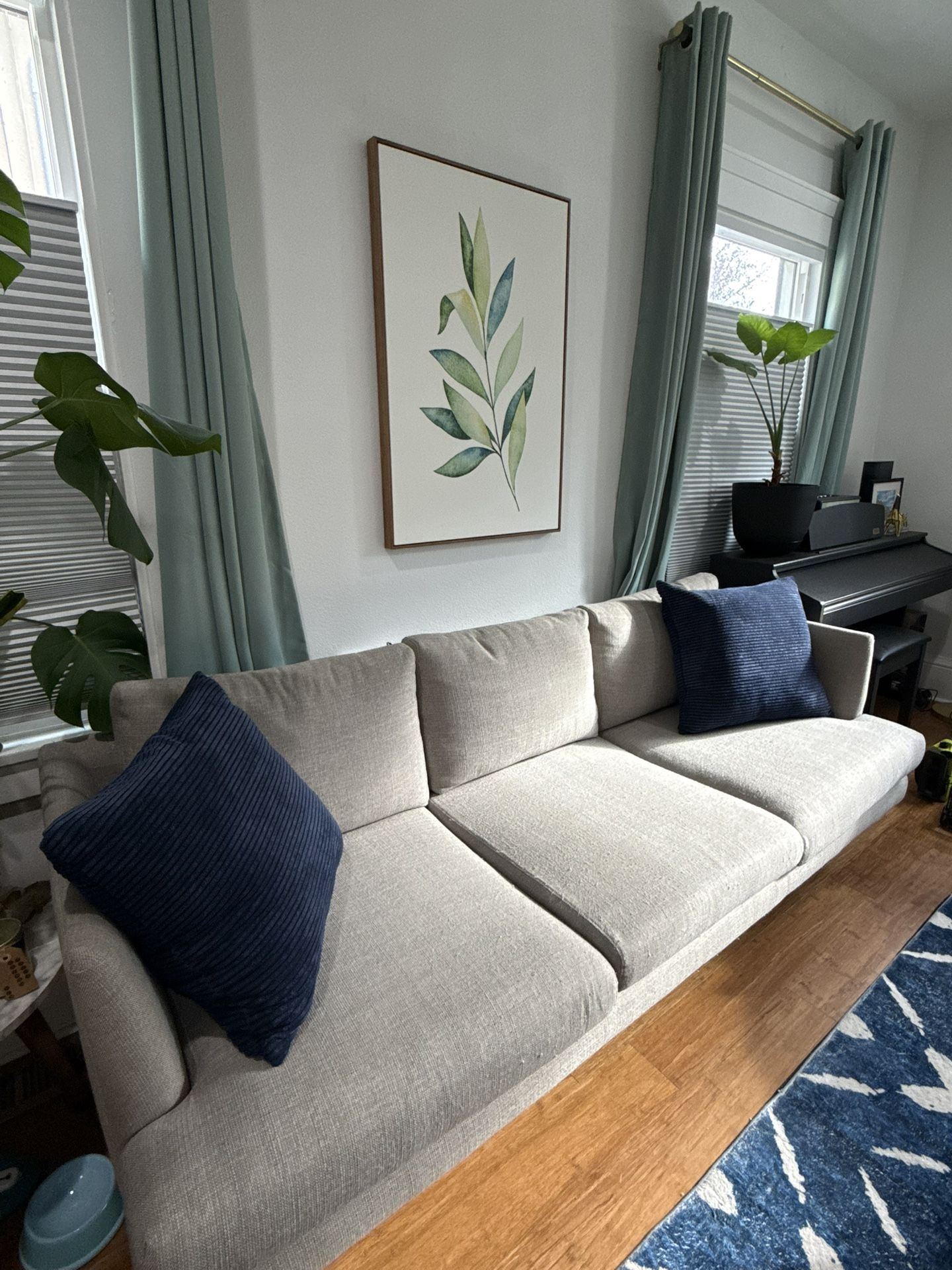 This mid-century modern sofa (84 inches long and light grey color) is a great fit in any living room, has a solid wooden frame and removable/washable cushion covers to make upkeep super easy. It’s used but in great condition (no stains on it). This is a great couch that comfortably sits 3-4 people! Pick-up only from Oakland. Thank you!