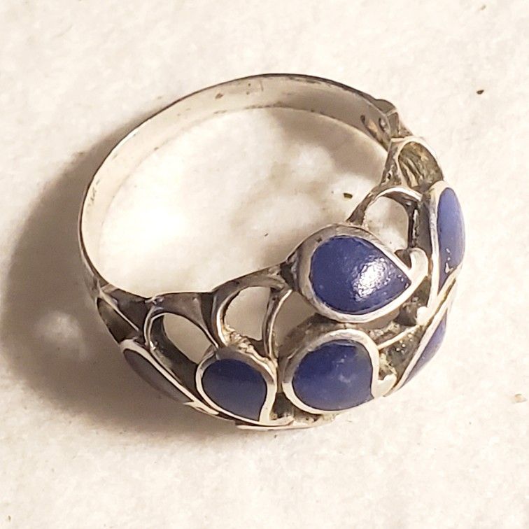 Vintage openwork sterling silver ring featuring multiple oval-shaped lapis lazuli gemstones.