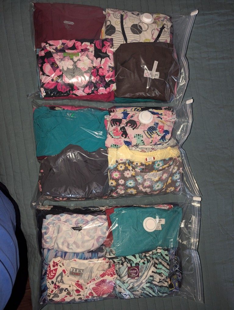 A couple new with no tags but mainly used. In great condition. A couple of medium size the rest are L and XL. There is a total of 66 tops 22 in each bag. $250 all 3 bags or $5 ea