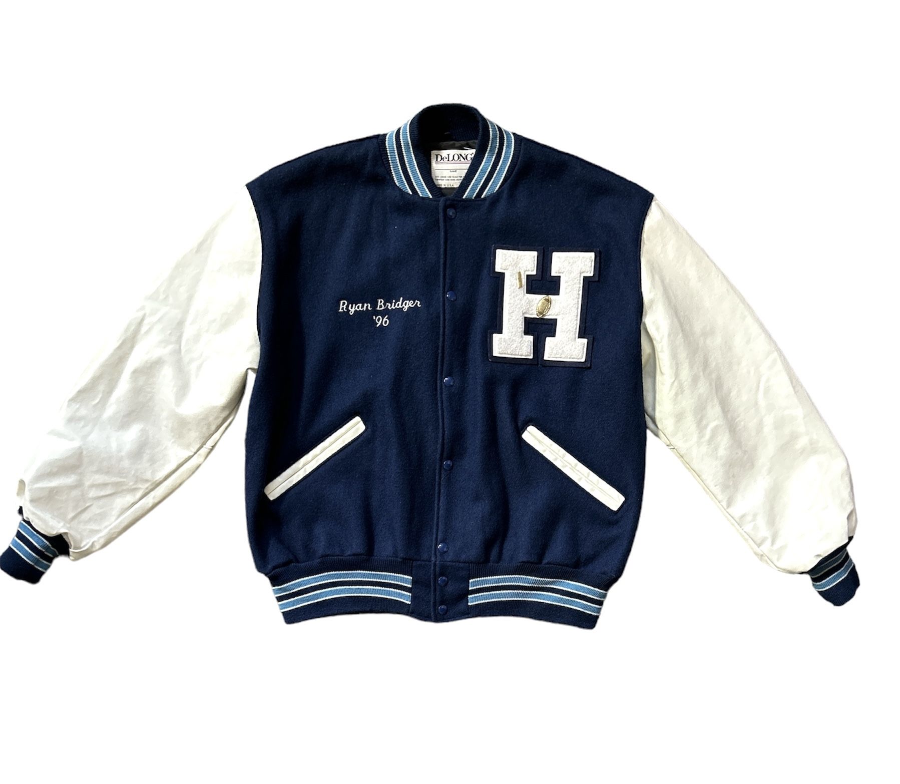Vintage DeLong Made in USA Blue Leather Varsity Letterman Jacket Size: XL
