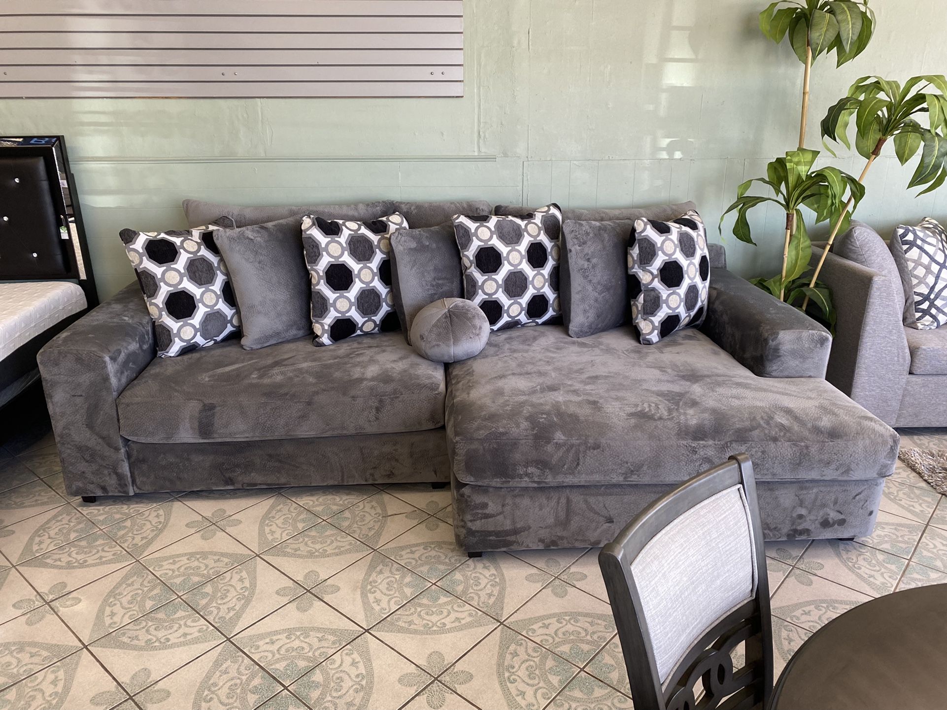 Grey comfortable sectional with upgraded fabric and designed pillows¡¡NEW!! ✅available in black ‼️Take it home with only $39 down easy approval‼️ 100 days same as cash no interest Come pick up or ask for delivery 🚚 Completamente nuevos Ven por el o pregunta por tu entrega 🚚