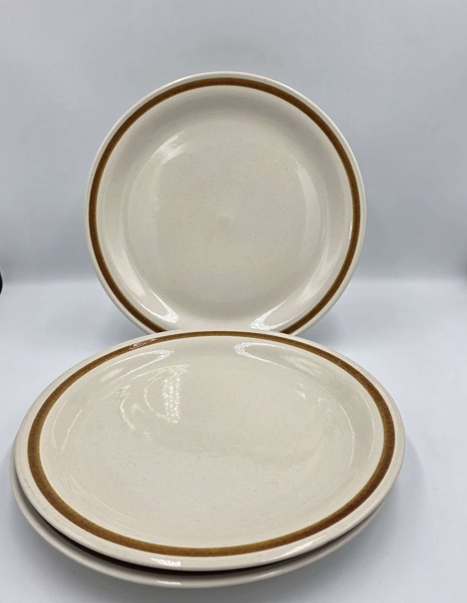 The Mountain Wood Collection Vanilla Spice 10.5" Stoneware Dinner Plates are a set of three vintage 1970's round plates from Japan, featuring a glossy finish and vintage pattern. These mid-century modern plates are oven, microwave, and dishwasher safe, making them practical for all occasions. The art pottery production style and late 20th-century era add to their unique charm, making them a stylish addition to any table setting. Perfect for those who appreciate original vintage pieces with a retro flair. Great condition. Very light wear. No chips. No cracks.