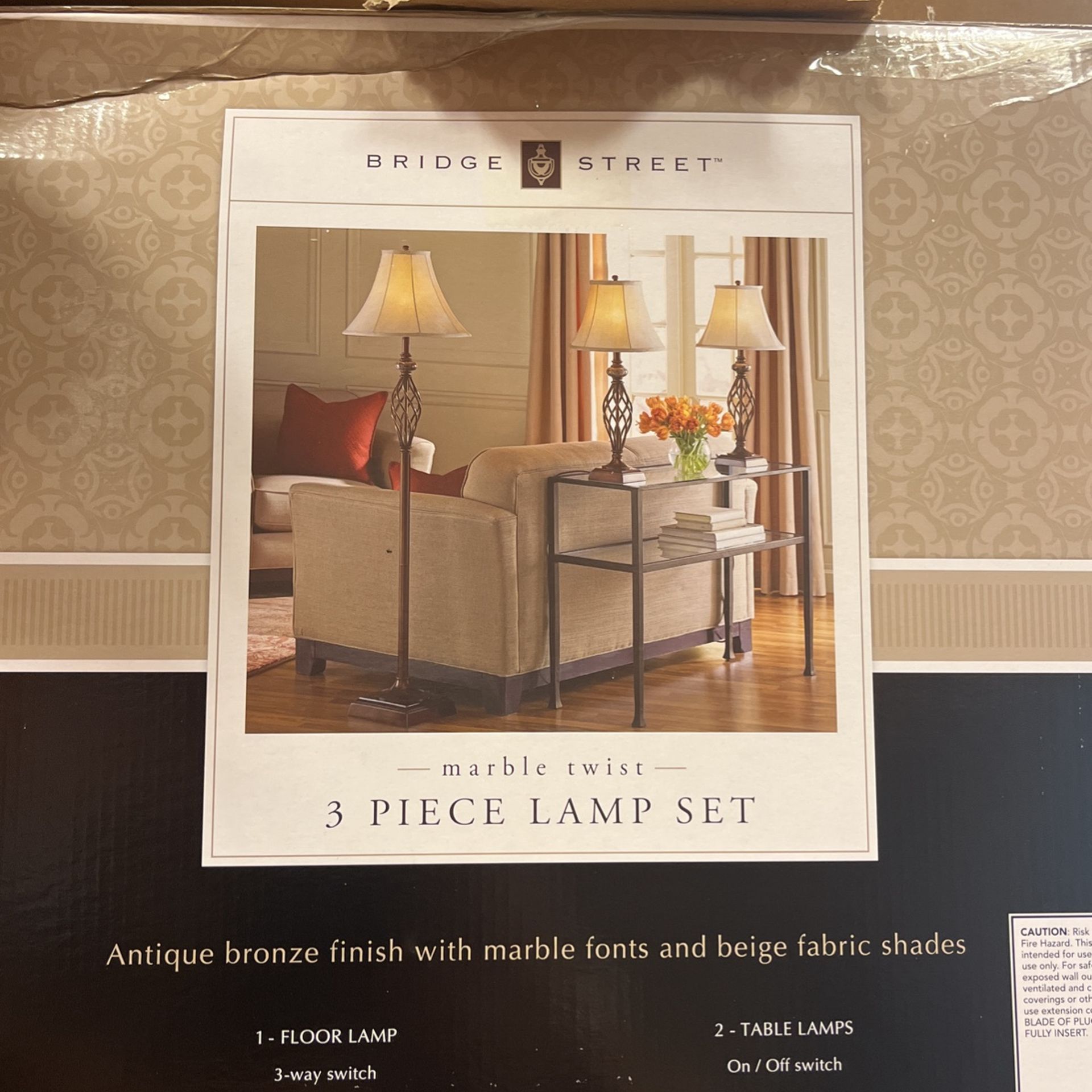 A beautiful 3 lamp set with a free gift of a night light . Cream color and brown leg.
