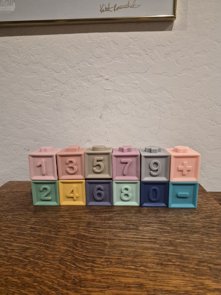 Baby Toys Silicone Soft Blocks SmartBrain Soft silicone building blocks designed for sensory learning and early development in babies and toddlers. Material: Made from BPA-free, food-grade silicone, making them safe for teething. Features: Each block features raised numbers, shapes, and patterns to support counting and tactile recognition. Use: Suitable for stacking, squeezing, and bath time play. Age Range: Generally recommended for infants aged 6 months and up.