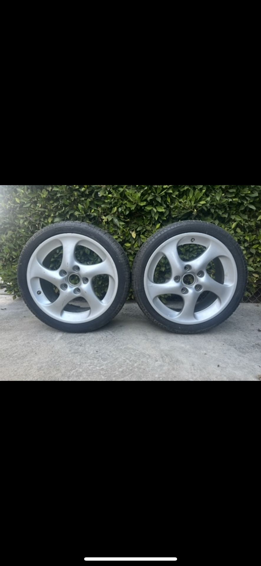 996 Turbo front hollowspoke wheels. Good condition with no bends, but could do with the fronts repainting. Fits both narrow body and wide body cars.