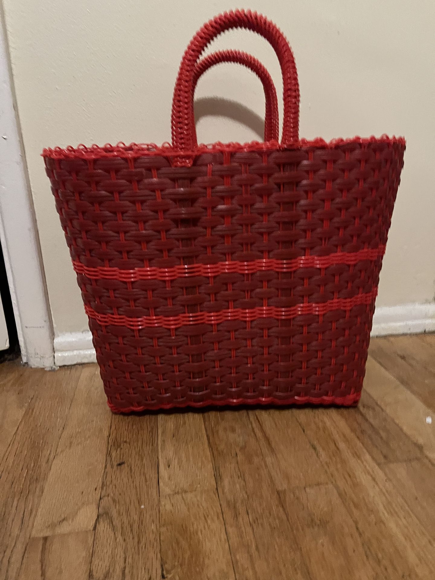 Hand woven plastic tote. From mexico. Sturdy. I have other colors/sizes available. Approximately 11.5x11.5 inches