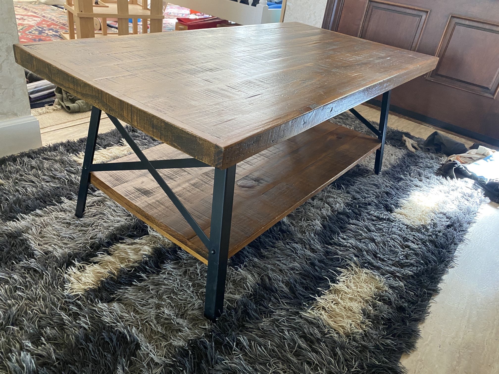 Laguna Solid Wood Coffee Table Natural Pine Brown This coffee table leans into its coastal farmhouse look with natural wood finishes and a mixed material design. The tabletop is made from solid pine wood and has a butcher block style with visible wood grain, knots, and turned to rub for a rustic, antique look. Four flared legs with X-shaped supports create a farmhouse base. Plus, there's an open bottom shelf where you can keep stacks of books or storage baskets. It measures 48" long, making it ideal in any living room.