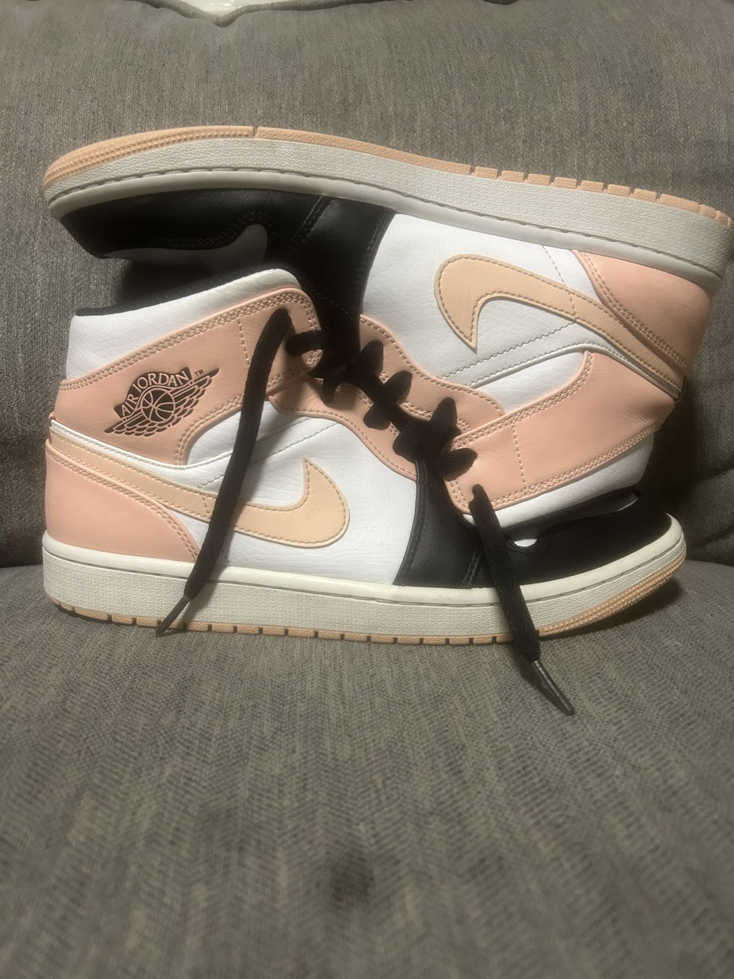Real authentic,Used twice. Air Jordan 1 mid Arctic Orange Crimson Tint black, white and pink color Size/9.5 men's ⚠️there's a small scar on the back of the shoe and no box ⚠️