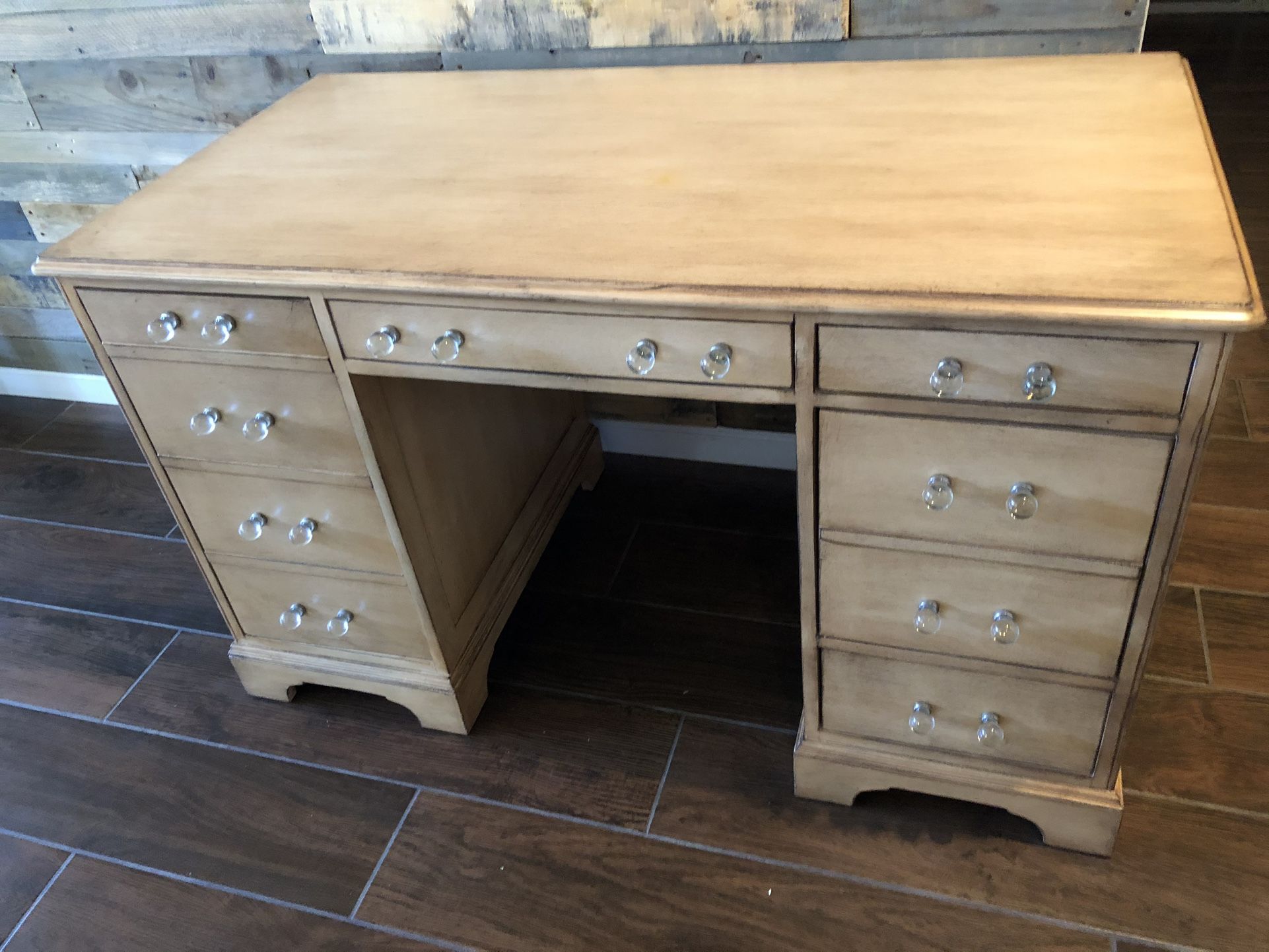 30.5”Hx50”Wx26”D Fully refinished solid wood desk Fully refinished by professional wood refinished. (The Village Woodsmith) Unique vintage ‘typing’ desk Previous buyer had no way to transport it when they got here.