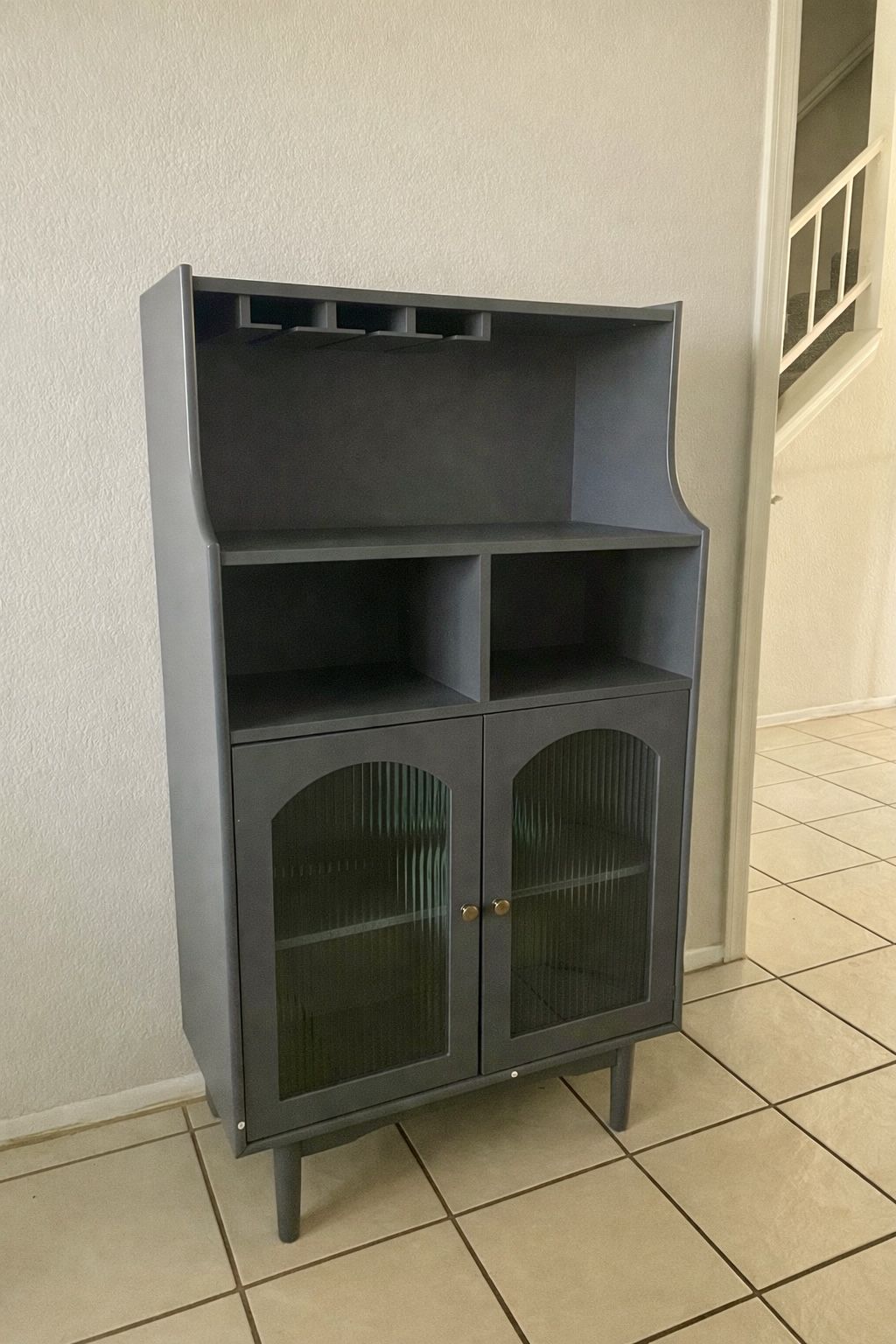 A modern blue-gray storage cabinet stands against a textured off-white wall, featuring open shelving above and elegant fluted glass doors below. Have only had for 6 months. Bought off amazon. The cabinet is empty and organized, with a clean tiled floor and a staircase visible in the background, creating a minimalist and orderly aesthetic perfect for showcasing storage solutions or interior design.