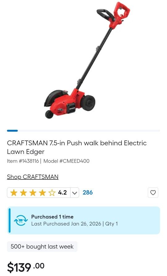 BRAND NEW NEVER OPENED CRAFTSMAN 7.5-in Push walk behind Electric Lawn Edger Retail Cost $139 + tax. I'm asking for only $120 If post is up, its still available π