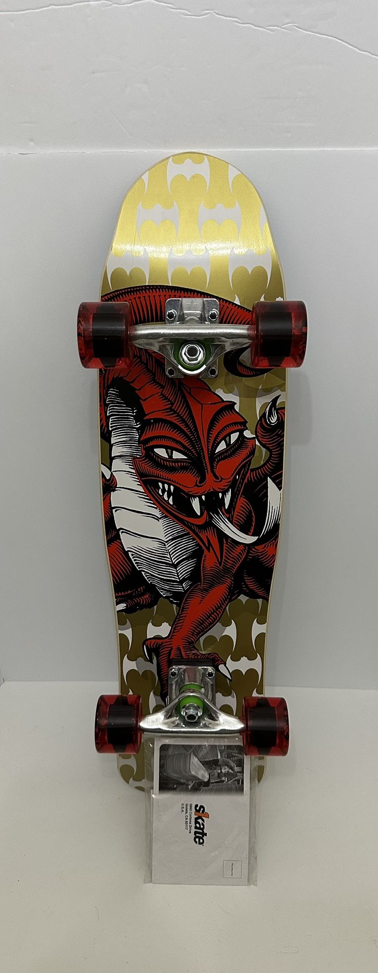 New Powell Peralta Mini Cab DragonGold skateboard. 29.5” long, 8” deck width. Comes with attached booklet. Complete and ready to go!