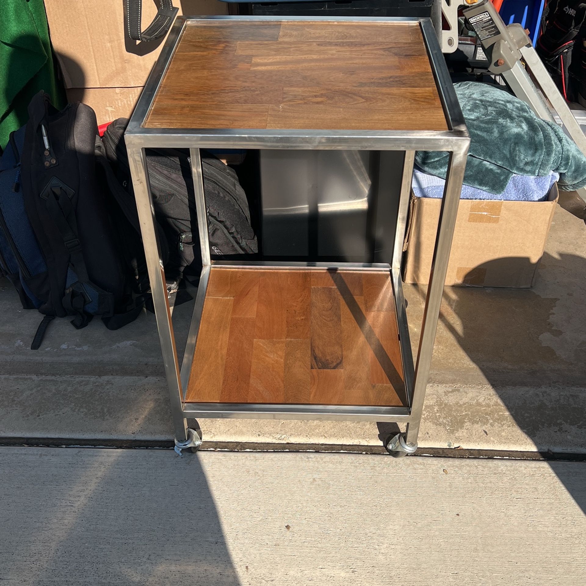 Stainless steel frame with solid wood top and bottom table tops. Frame is slightly tarnished on top edge. Heavy duty / solid frame.