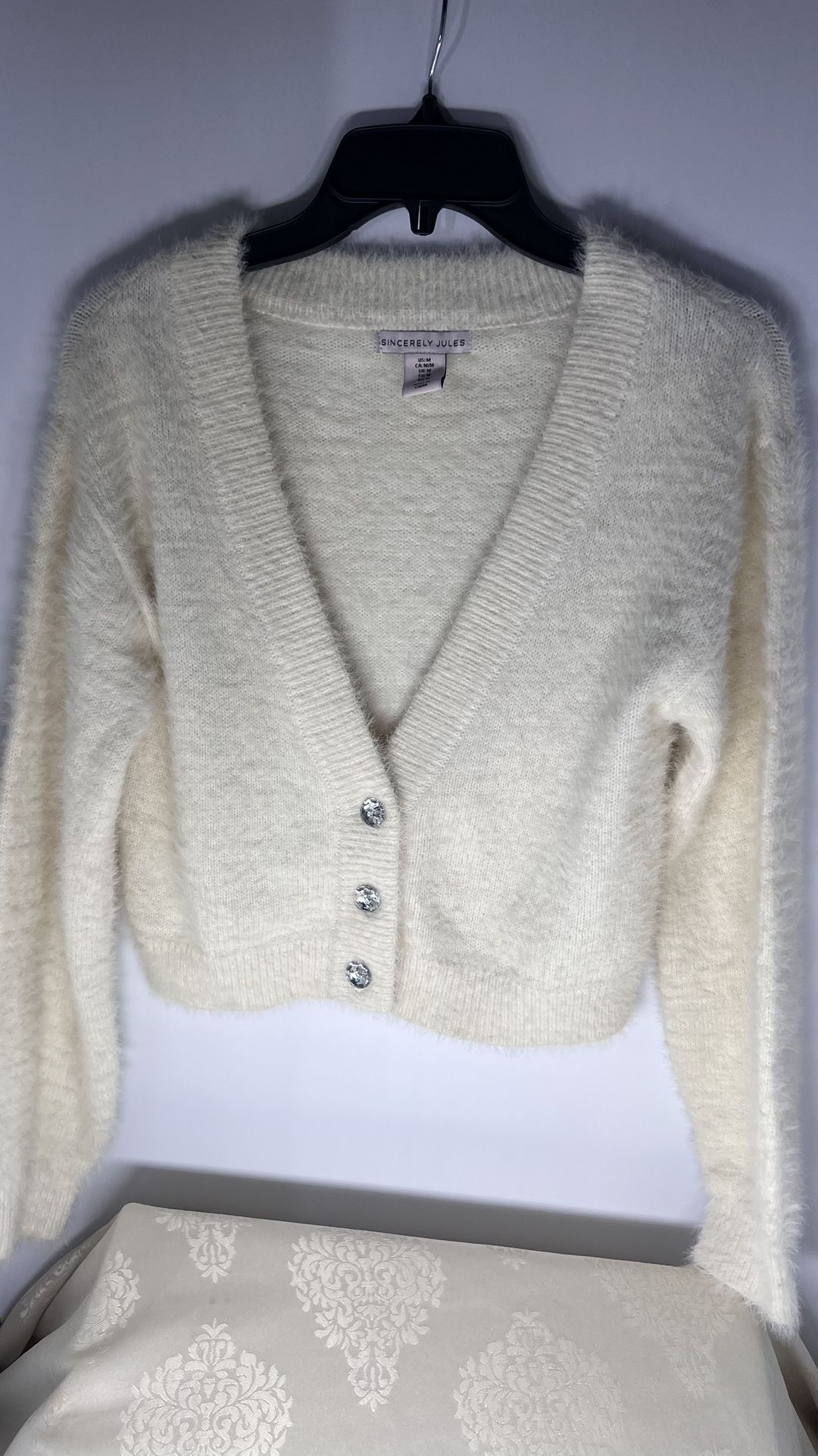 Fuzzy Cream Cropped Sweater Cardigan With Three Buttons, By Sincerely Jules