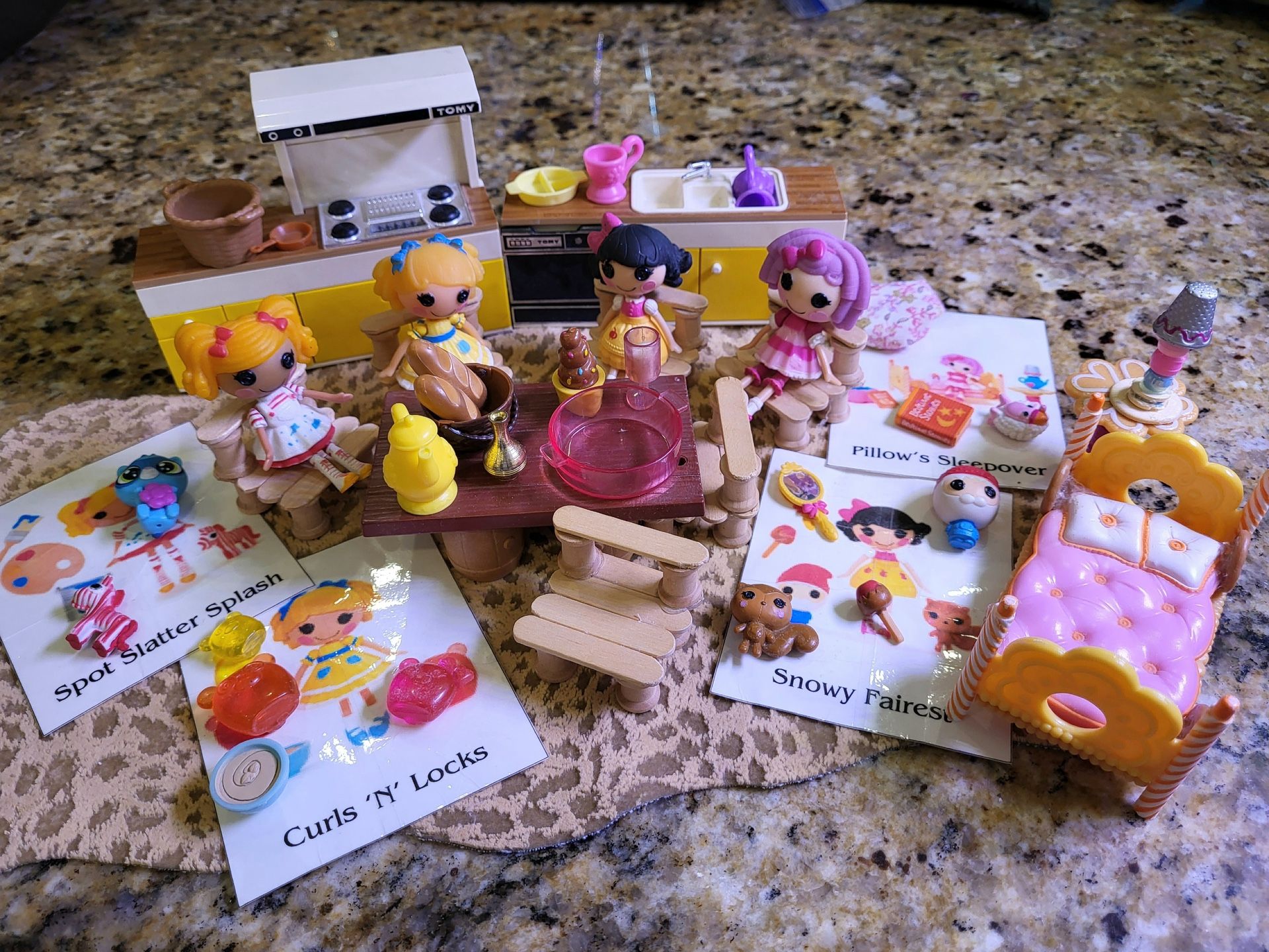 Mini LaLaLoopsy Dolls playset And some vintage doll furniture (plastic) Handmade wooden chairs & Carpet Toys styled by Grandma Renee for grandchildren