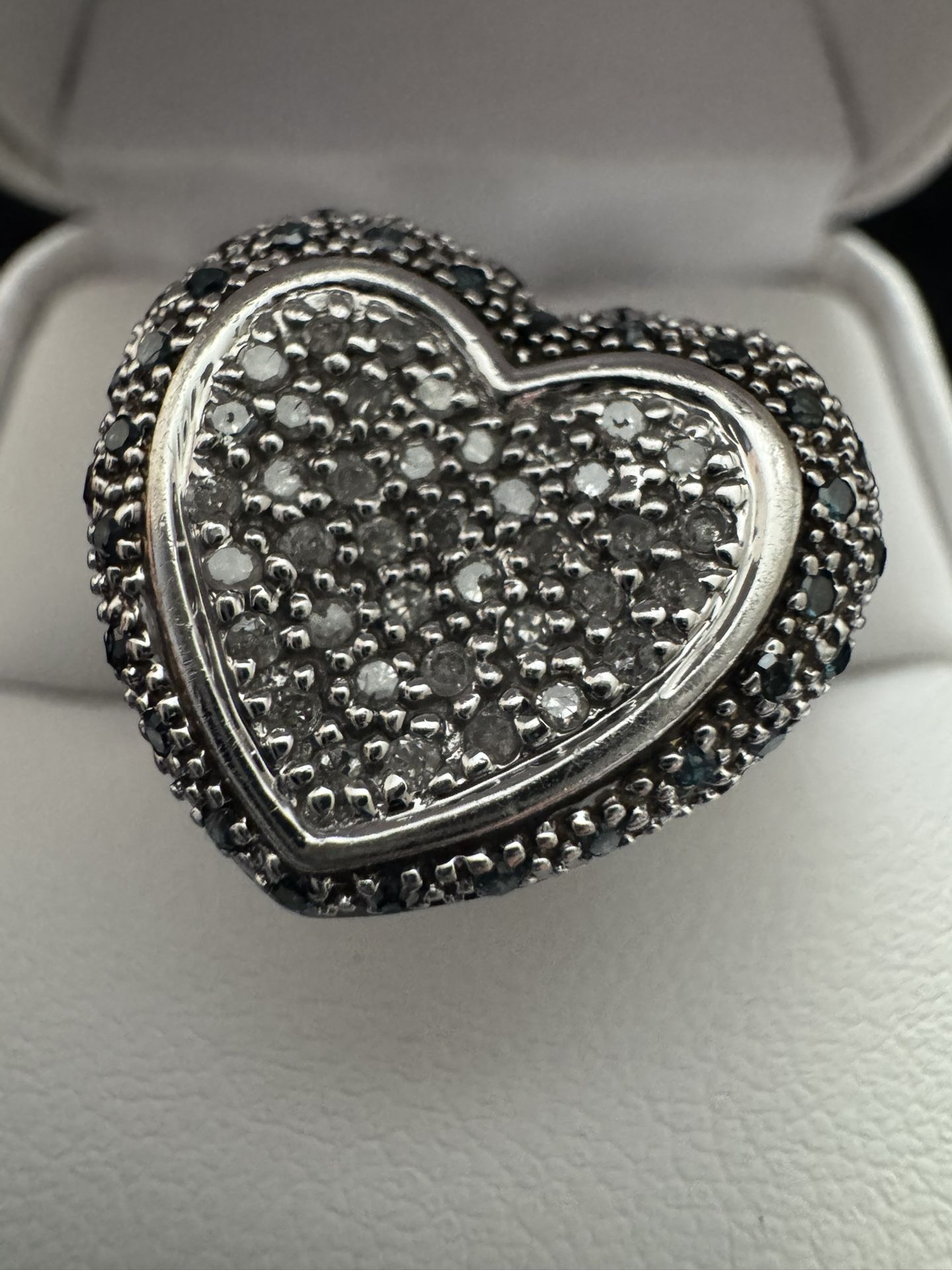 Sterling Silver ~1/2CTW Blue & White Diamond Heart Ring Size 8
