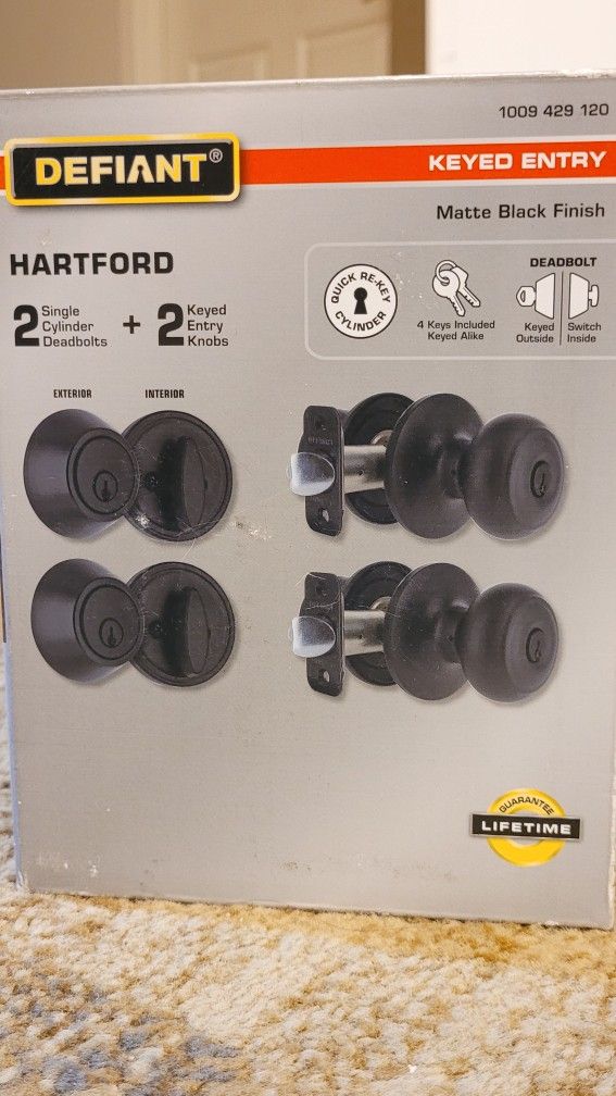 Matte Black Finish. 2 door knobs w/ 2 deadbolts. Includes 4 keys. NEW never used. $35 obo. Pick-up near Mesa Riverview.