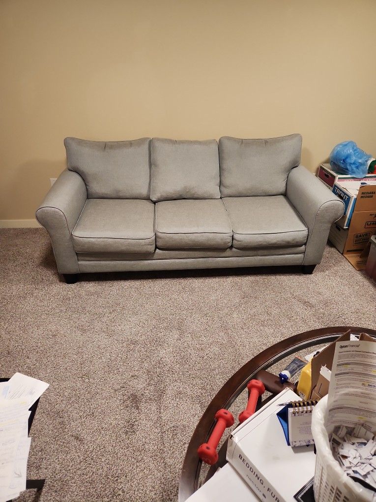Fusion Furniture by AFW Brienne style sofa of the set of the other Brienne furniture. Grey with blue tone color, two years old, like new condition, 88 inches long by 37 inches high by 38 inches deep. Was $498 x 8.2% = $538 new. It's constructed of hardwoods and plywood, quality foam cushion core constructioln, it's covered in the light blue and gray 100% polypropylene cover. Spot clean with water-free solvents because it features performance fabric cover that is designed to resist stains and spills.