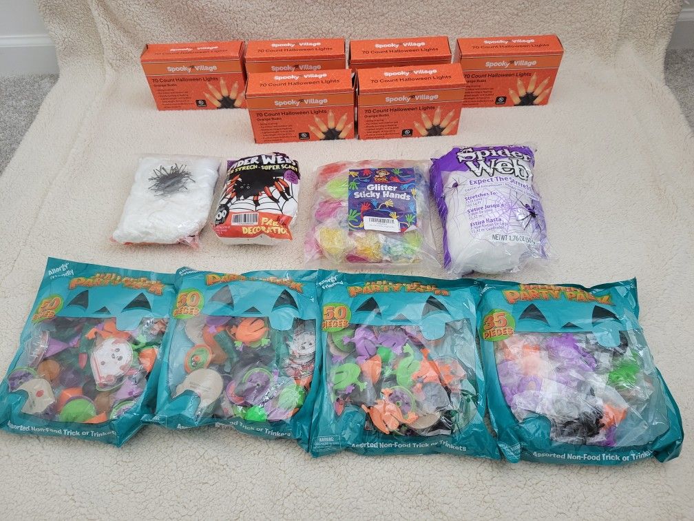 70 count lights - 6 packs 200 Sq Ft spider Web with spiders- 2 packs 165 Sq Ft spider Web-1 pack Trick or treat variety packs-5 packs