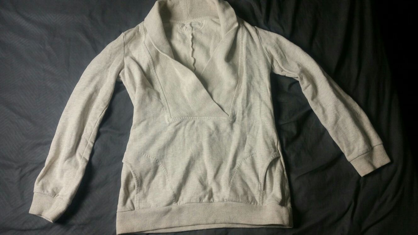 This is a Citizens of Humanity sweatshirt It is cream colored The collar folds down and the neck line plunges to the chest. There are two pockets on the front of the sweatshirt It is in really good condition. It has no stains, rips, snags, or tears.
