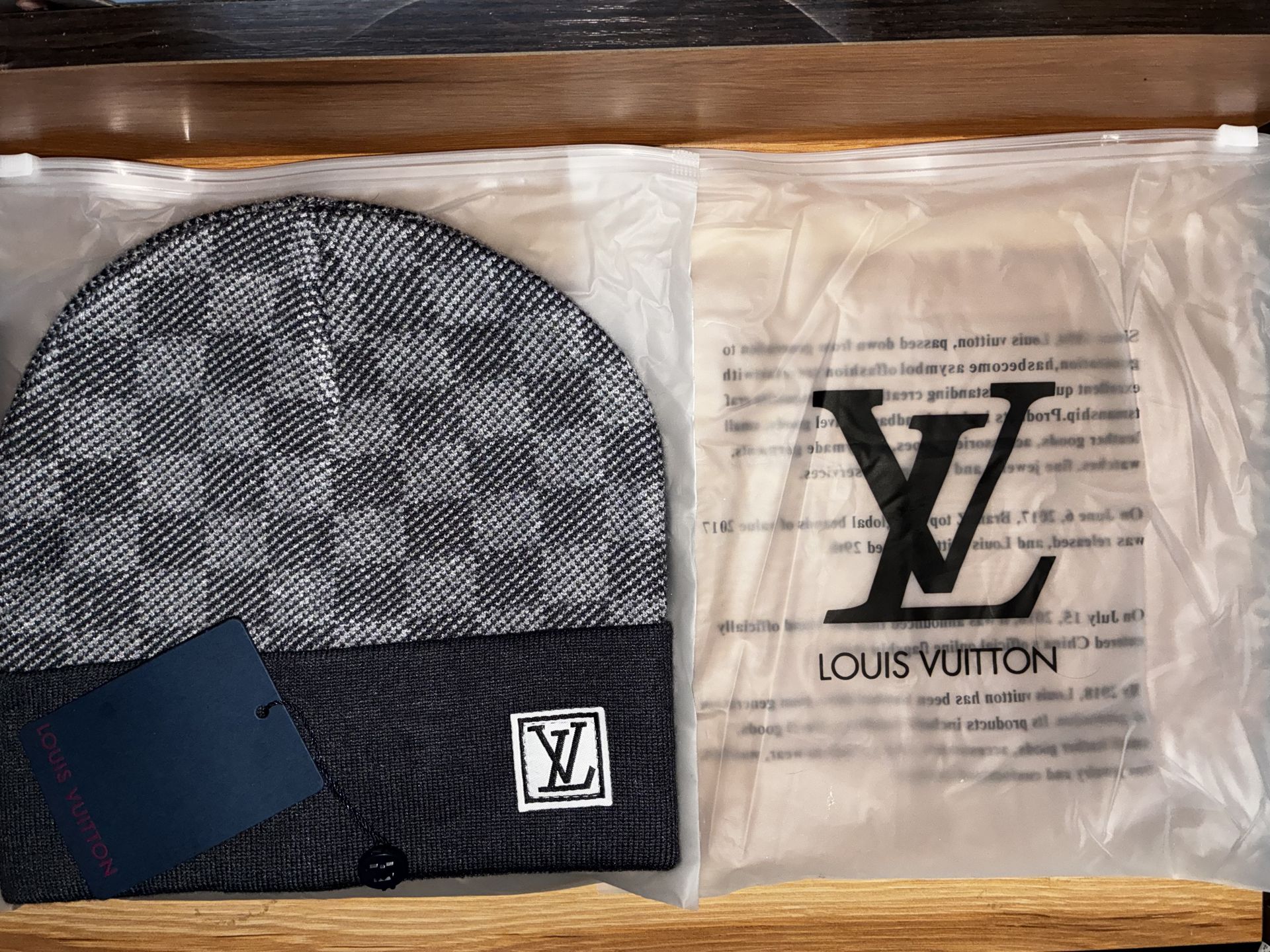 Brand new LV-style knit beanie in grey and black. Clean design with front logo patch. Great quality and perfect for everyday wear during fall & winter. • Condition: New • Color: Grey/Black • Comfortable stretch fit • Comes as shown in photos Local meetup Cash/Cashapp Serious buyers only.