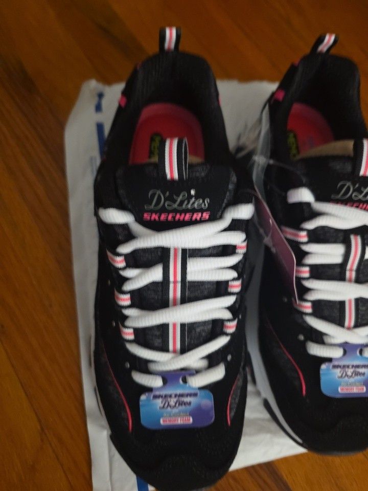 Selling a pair of brand new Skechers D'Lites sneakers! They are black with pink accents and have a white sole. Very comfortable and stylish, perfect for everyday wear 7 1/2 no box