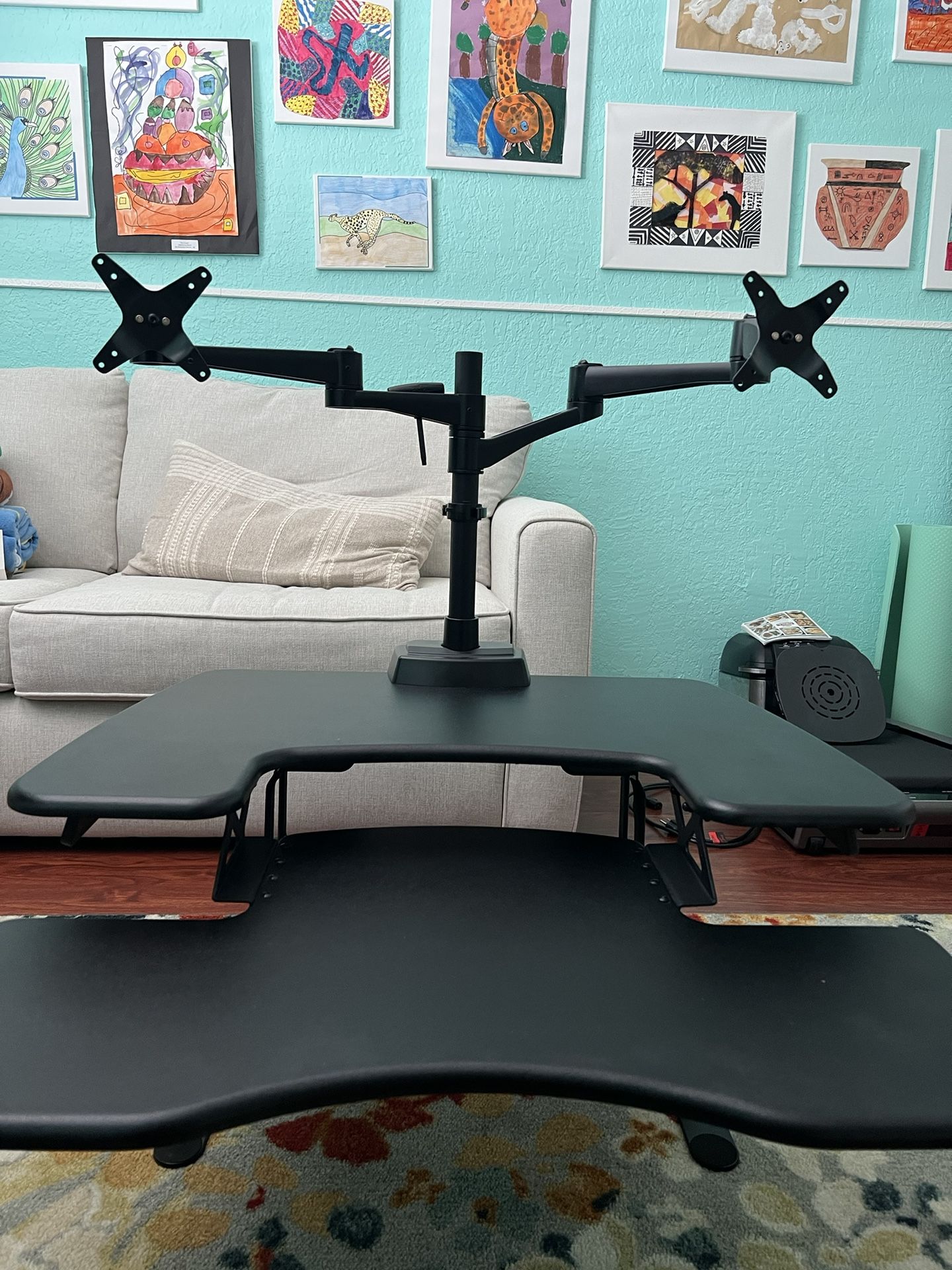 Turn any desk into a standing desk. Two tier design with lower keyboard/mouse deck. Posture curve and dual handle rowing lift. Spring assisted lift. 30 inches wide. Delivered fully assembled with dual monitor arms. Max monitor size is 27” x 2.