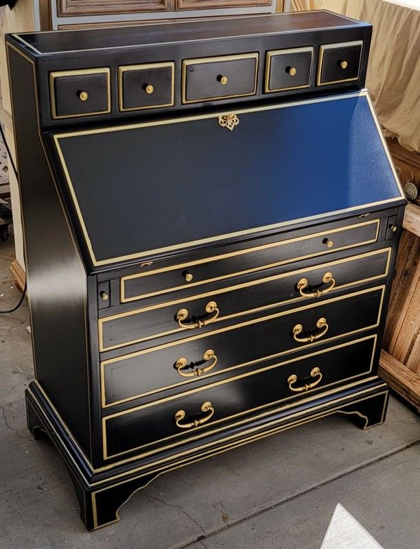 Unique Touchstone drop front desk painted in black with gold accents Measures 38x48x19. Delivery can be arranged .