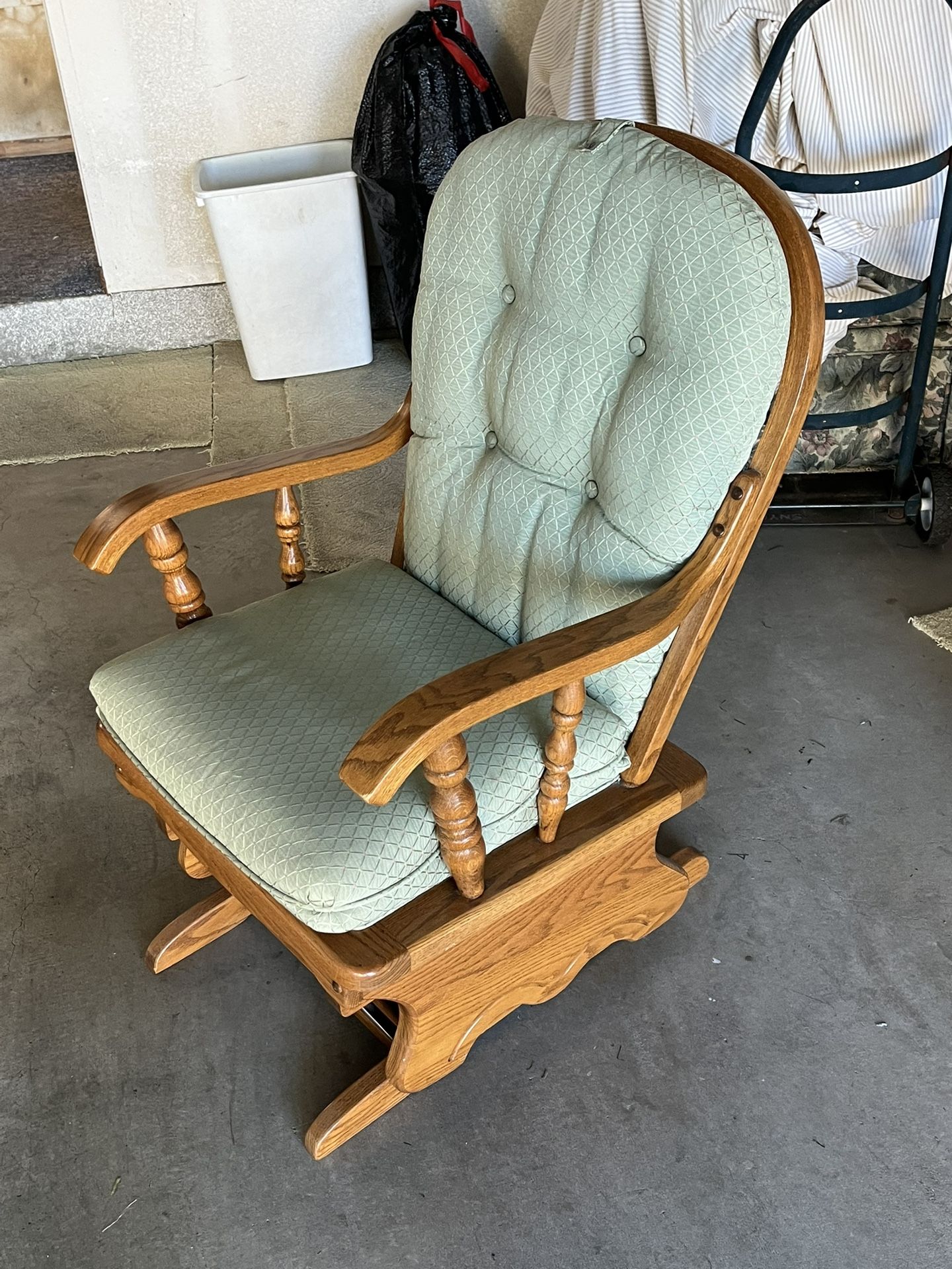 This rocking chair is solid, no rips, or tears. In excellent condition. First one with $30 Cash takes it! Many other items available as well.