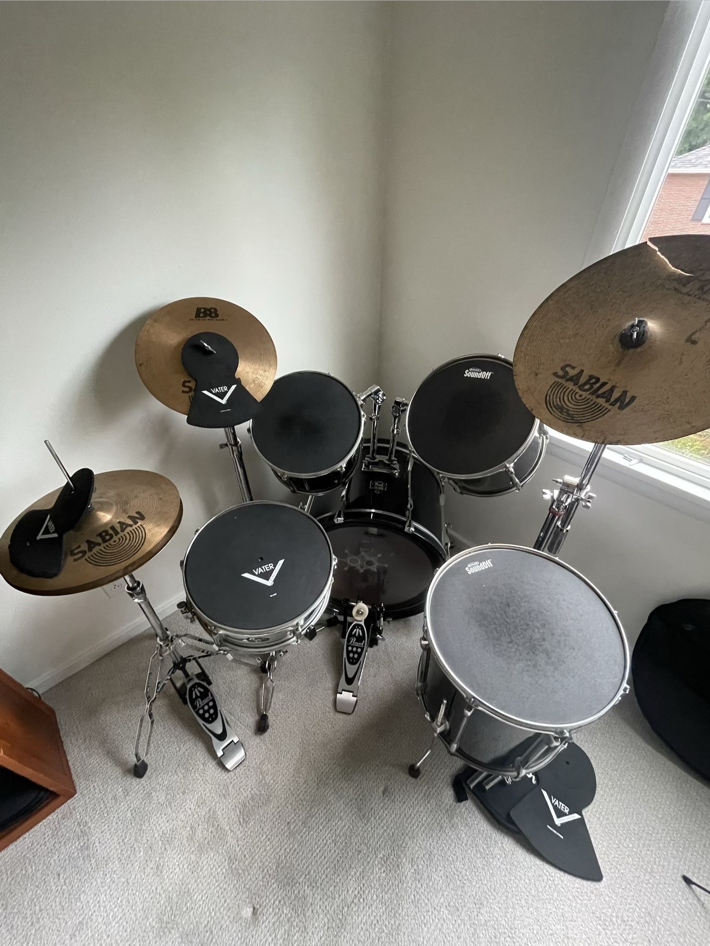 Pearl Export drum kit Rogers snare Sabian B8 14” high hat Sabian B8 14” thin crash Remo weatherking pinstripe heads Evans emad on the kick Tama Grestch Mapex Yamaha Ludwig PDP DW Zildjian