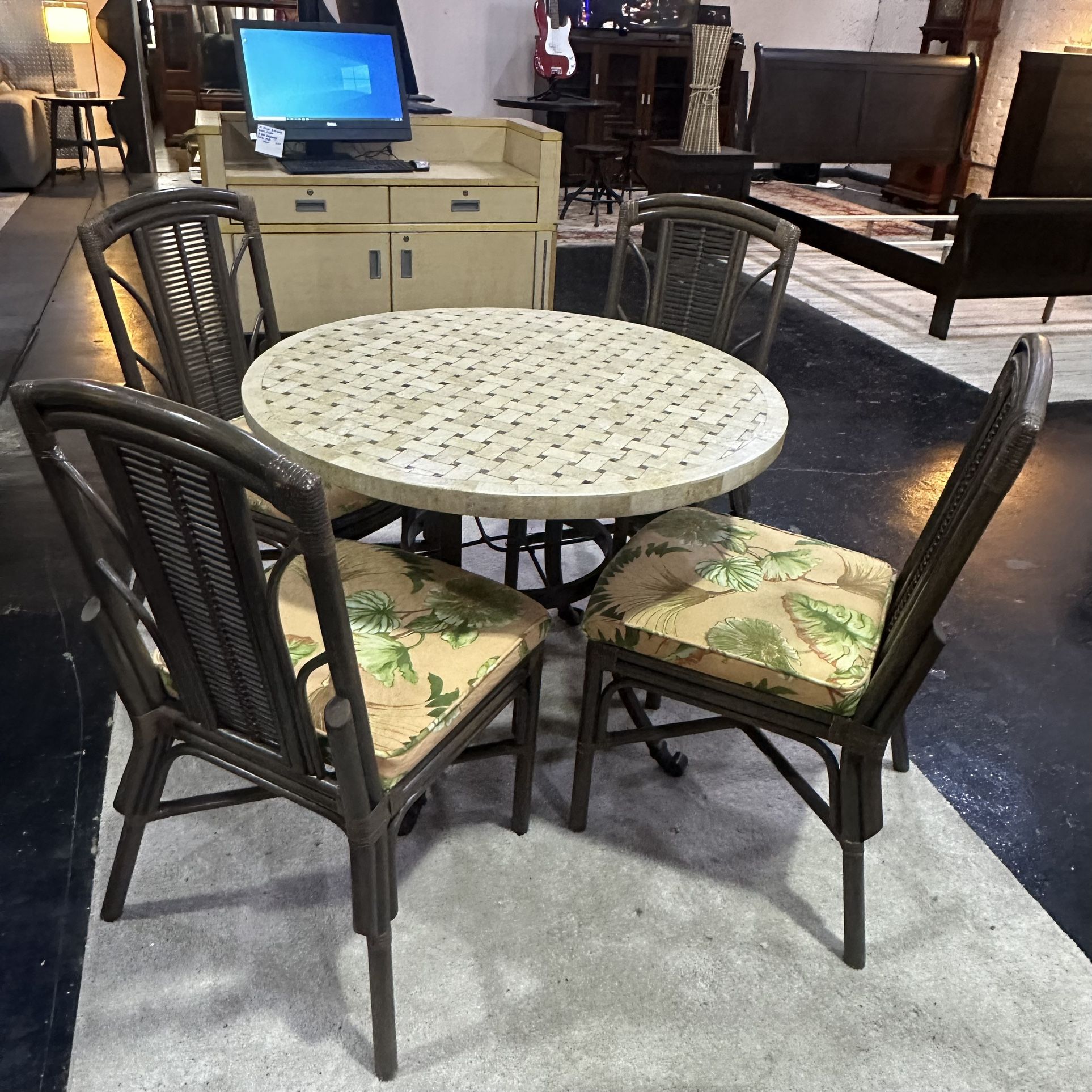 Round dining table with four rattan chairs and side table. Table is solid/sturdy with metal base - measures approximately 36 inches across by 28 inches high. 4 chairs are rattan with padded seat. All in good used condition - a few marks but no tears/rips noted. Includes matching side table that is approximately 24 inches across by 18 inches high. $225 for set. Pickup in Soulard. POOS. FCFS.