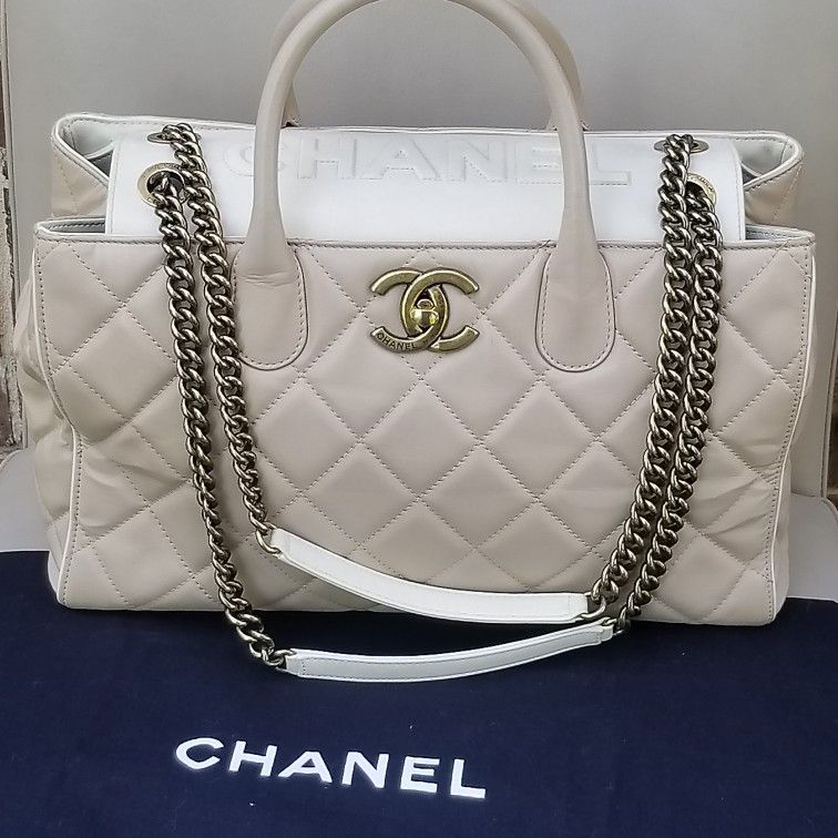 Beautiful Authentic Chanel Portobello Quilted Lambskin logo large chain strap CC turnlock Tote Handbag Great looking purse, always bound to be a stunning , elegant and fun classic, goes with almost every outfit. Makes an awesome everyday bag, great for work or play, go from business pro to light fun bag for a night out. Great pre-owned condition. I will give it an 8/10 condition wise. Overall, still really nice looking handbag condition: ** Some loss of shape when empty from storing it ** Minor darkening, scuffs, scratches and spots on exterior bottom edges, top cream white area and handles. **Scuffs and small spots underneath flap **scratches and some tarning on hardware **chain strap leather handles in excellent condition Accessories: Dust bag Measurements: L 14" x H 10.5" x D 5.5" handle drop 4.5" chain strap drop (doubled) 12" chain strap drop (single) 20" Exterior Material: Leather Exterior Color: eggshell Beige and Cream white Interior Material: Leather Interior Color: Gold Hardware Color: Antique Gold Was $6000 brand new $3250. cash and pick up in Arlington or closeby Grand Prairie Get your own authentication services done before purchase if that helps you feel much secure before purchasing. All items come with a 1000% money back guarantee on Authenticity.