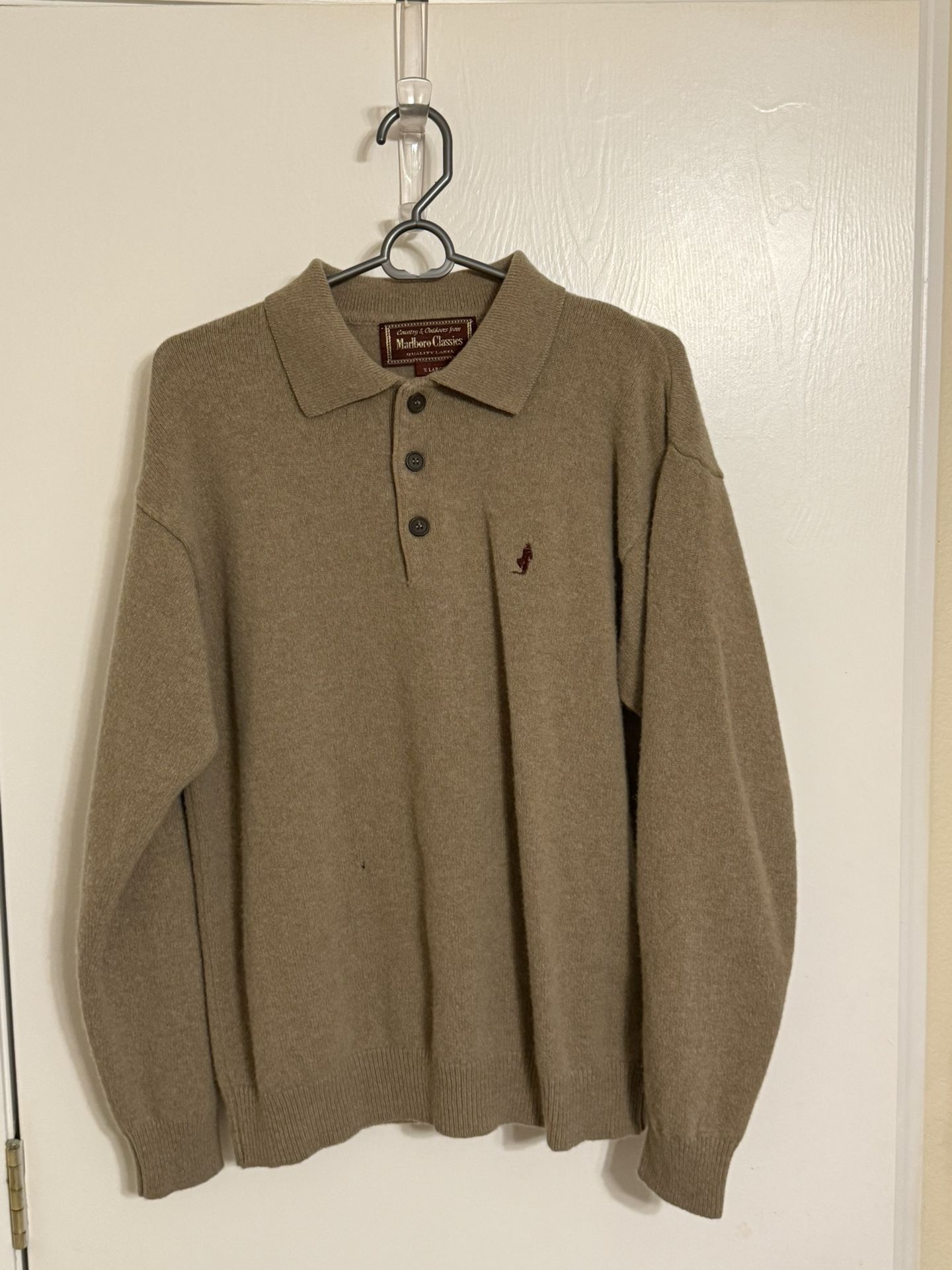 Vintage Marlboro Classics Wool Polo Knit (XL) Timeless Country & Outdoors Marlboro Classics piece — heavy wool-blend knit with button-up collar and signature embroidered logo on chest. Rare 1990s–early 2000s style, made with premium construction and perfect neutral color for layering. Details: • Size: XL • Condition: a few tiny holes, not noticeable unless looking for them • Color: Camel / Light Brown • Material: Wool blend (thick + soft texture) • Embroidered logo on chest • 3-button collar • Condition: Great overall — minor small marks on back (see photos) • Made under Marlboro Classics Quality Label Style: 90s outdoorswear / vintage western / rugged luxury aesthetic #MarlboroClassics #vintageknit #vintagepolo #90sstyle #heritagewear #outdoorfashion #westernwear #vintage