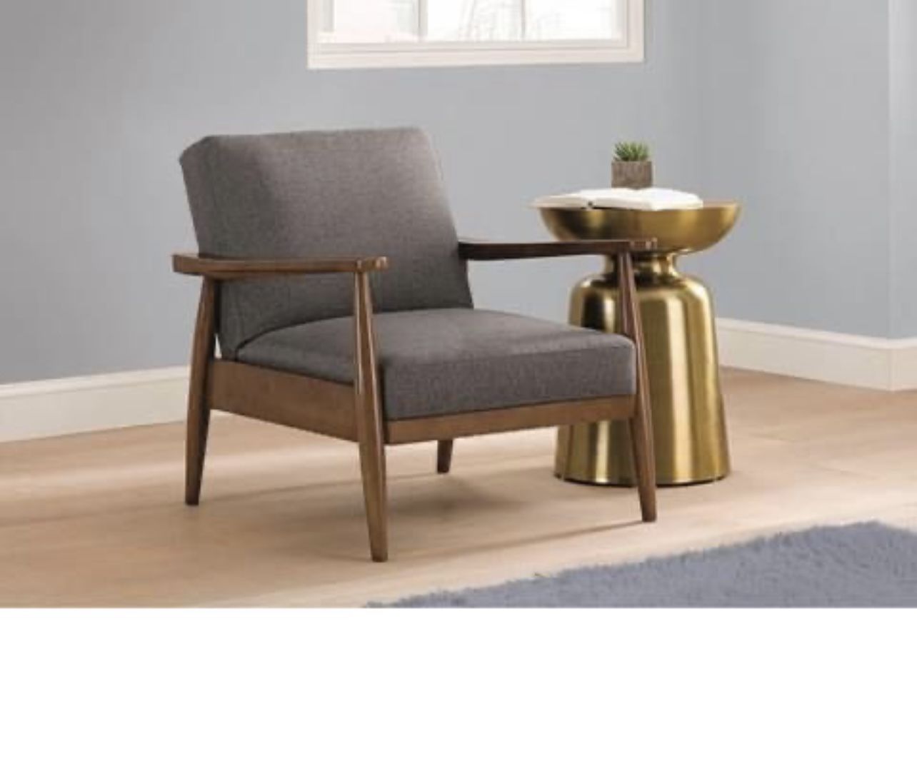 One available New in box Mid century modern design. Ideal for adults seeking refined living room seating or a home office desk chair Linen upholstery with a durable wood frame offering optimal support Back reclines into a comfortable lounging position perfect for reading Easy assembly. 1-year limited warranty. Available in Blue and Gray linen. Product dimensions: 29"L x 34"W x 32"H.