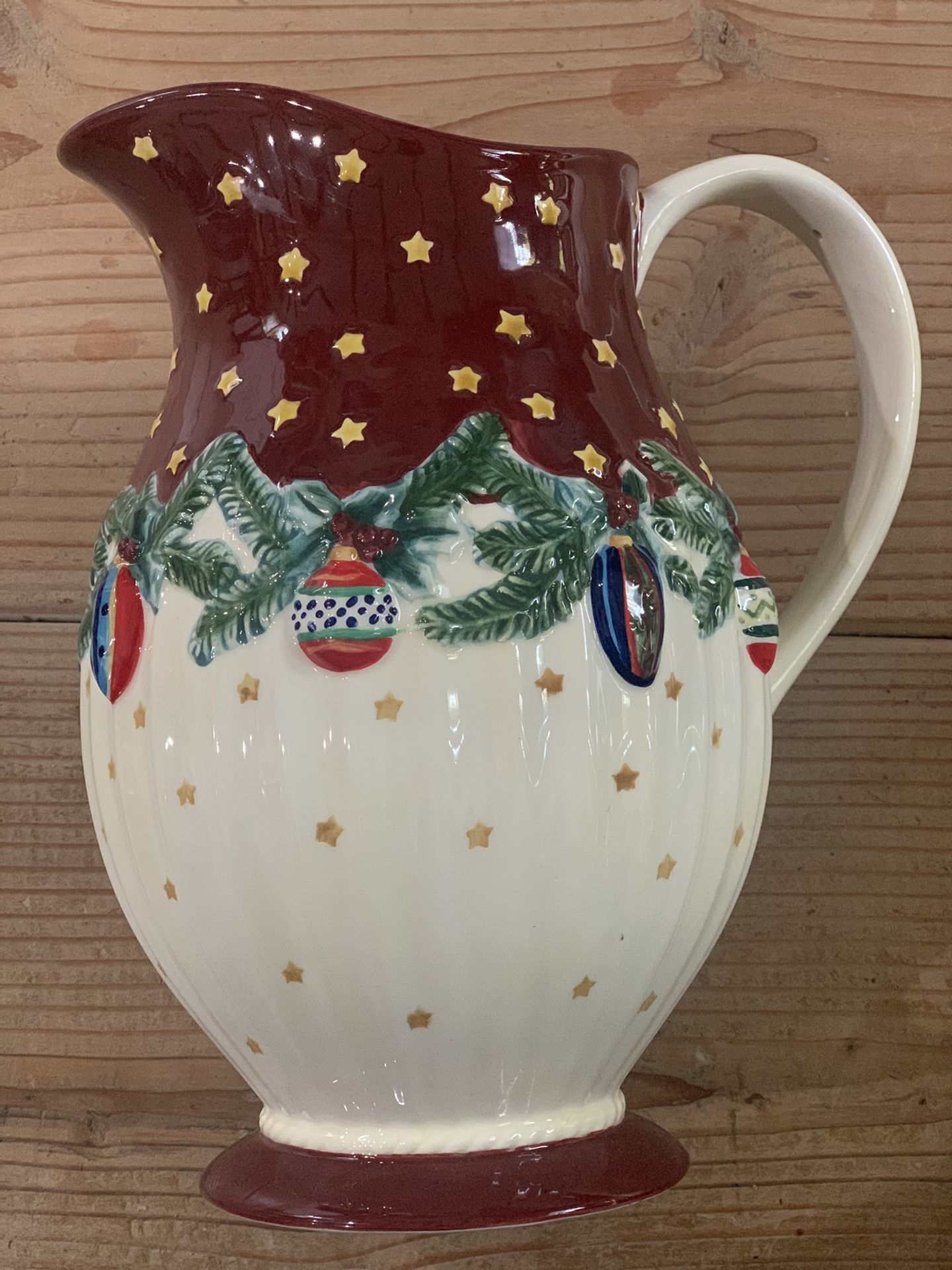 This Farberware Holiday Treats Pitcher is the perfect addition to any collection. The unique multicolor design on this ceramic pitcher makes it a great display piece or functional item for serving drinks. The brand Farberware is known for their quality products and this pitcher is no exception. Use it for holiday gatherings or everyday use, it is sure to impress. Measures 11” high and 10” wide