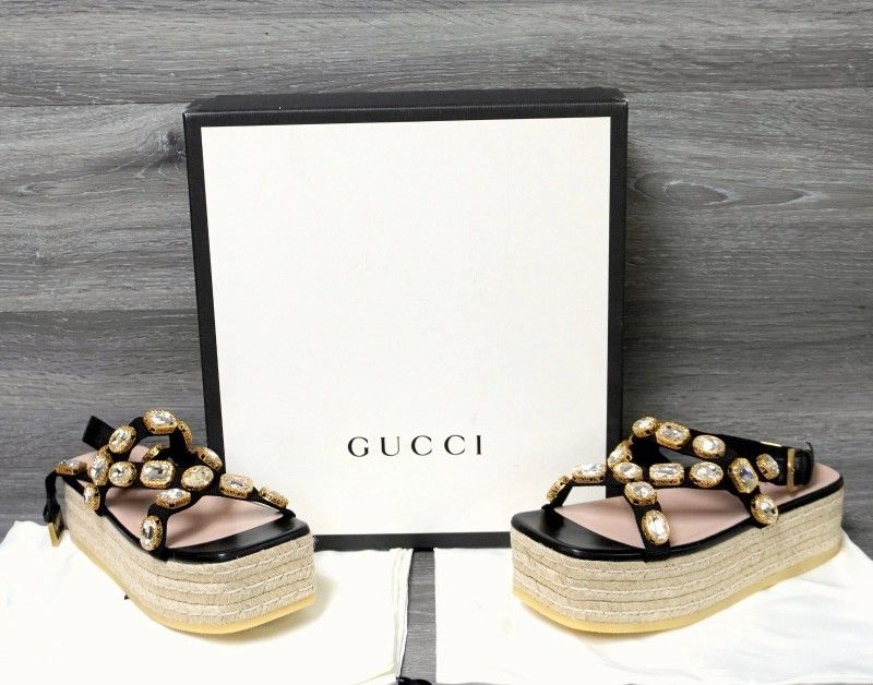 Gucci Size 36.5 Black Grosgrain Crystal Embellished Espadrille Platform Sandals
