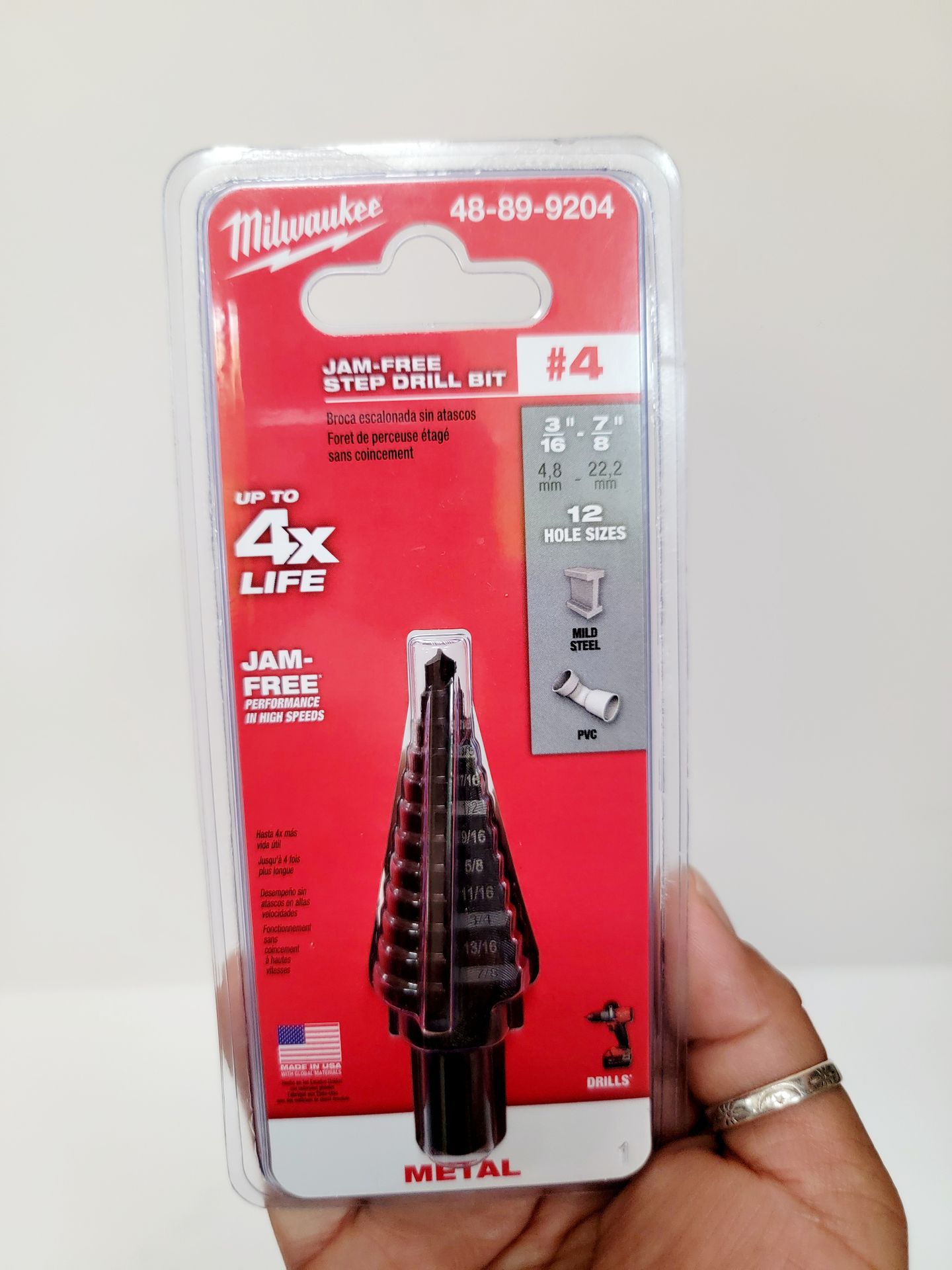 Milwaukee #4 Jam-Free Step Drill Bit. This thing is super durable, has up to 4x life. Great for drilling mild steel and PVC. It has a Rapid Strike Tip for faster drilling and 12 different hole sizes from 3/16" to 7/8". Super handy tool.