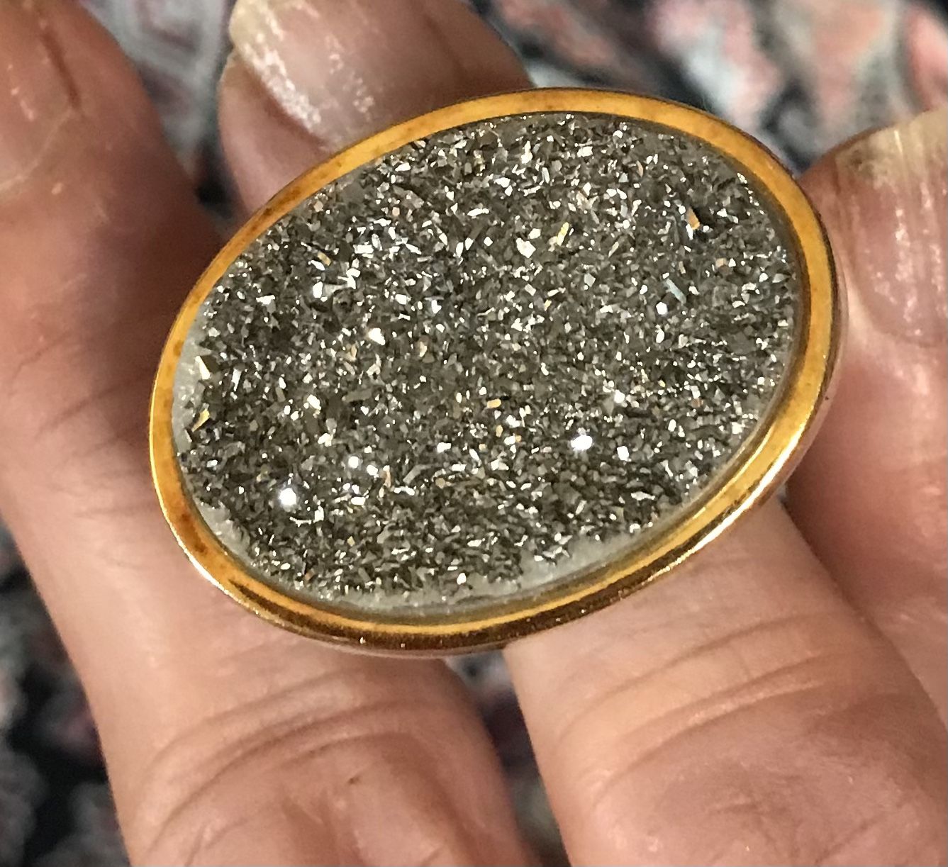 This ring is absolutely stunning on and is in new condition. I’ve had it about 35 years. It looks great worn with lots of outfits. The gold is very shiny and the druzy is top quality with lots of sparkle. The outer band is a milky white glassy substance. I’m not sure what it’s made of. But it’s strong and perfect for its roll in the ring. Looks and feels great on and is sure to bring many compliments