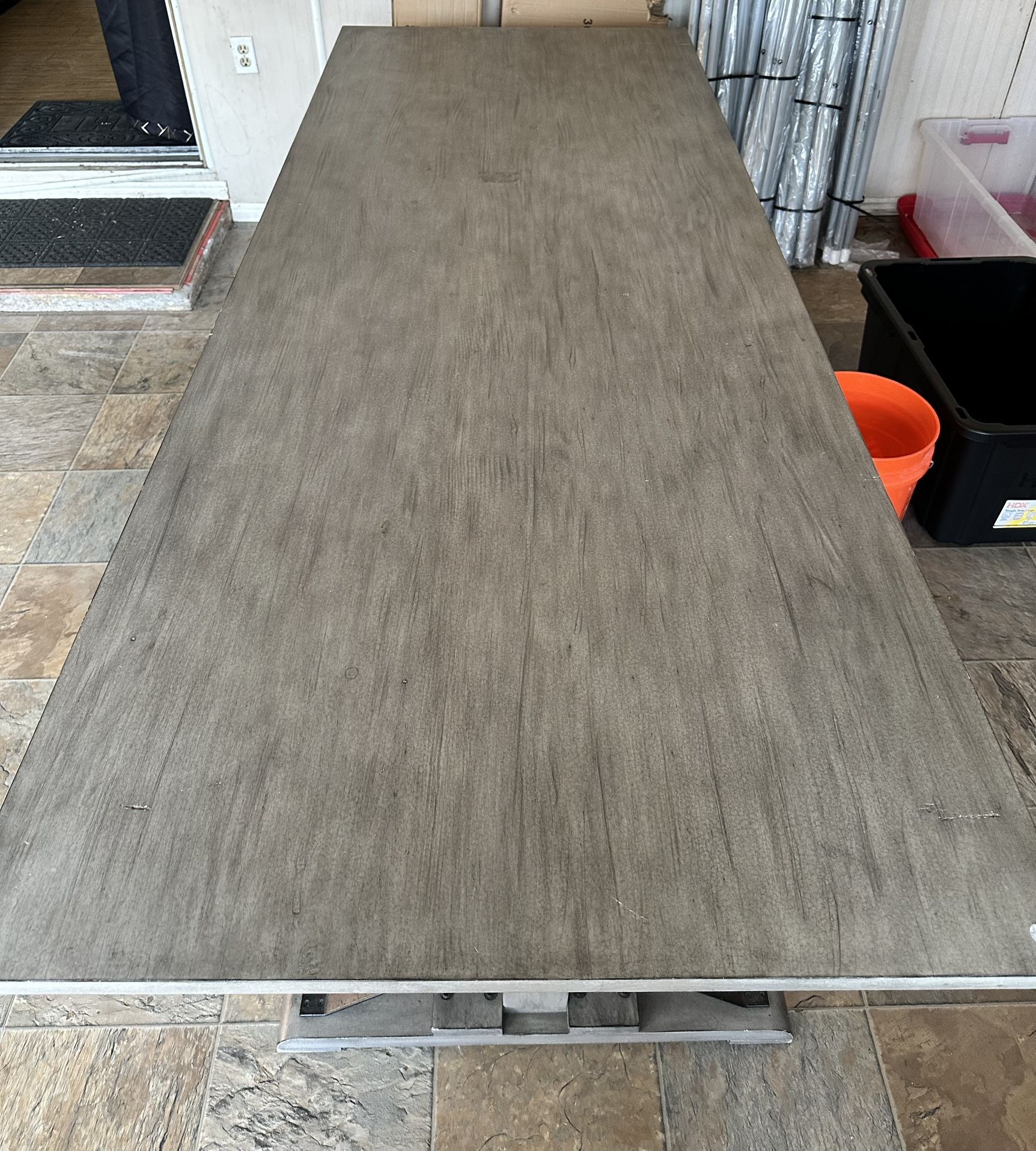 Make an offer Spacious table for sale. Has a cool gray wood-look top with sturdy metal and wood base. Great for dining or big projects. Easy to take apart for moving.