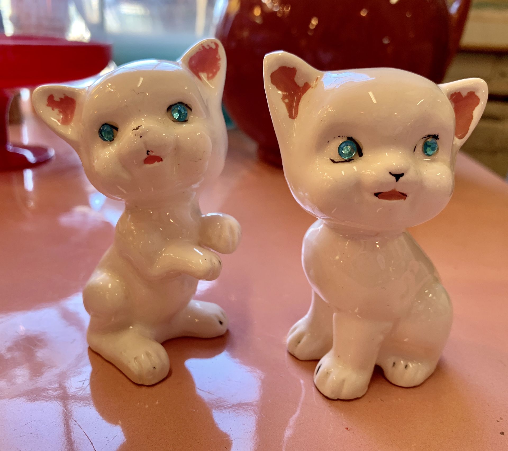 Absolutely Adorable Vintage pair of marked “Kreiss” Kittens with Blue Rhinestone eyes, solid white glazed and overpainted features with added rhinestone eyes circa 1950-60’s Mid-Century ceramic kitten statuette pair in very good condition with minimal over-glaze painted paint loss on inner ears, eyes, etc See photos for perspective, size, details and Condition Sale offered is ONLY for Item in title, unless otherwise stated in description, anything else in photos is for visual merchandising, measurements and perspective of size only! Contact me for estimates on US *shipping & delivery charges within Connecticut (*If OfferUp doesn’t make their shipping options available*) other New England area delivery possible- for additional charges please message/other New England area delivery possible- for additional charges please message) See all the other Unique Antique, Vintage & Cool Collectible items we have for sale at Wicked Good Bones ☠️ on OfferUp- Just click on the Adorable Orange Kitty to view our offerings, as well as our info & ratings! Reasonable offers welcome!
