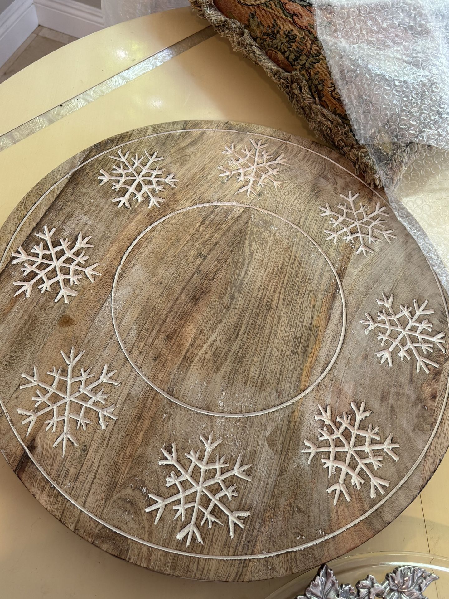 Holiday Time wooden Lazy Susan with white snowflake motifs 19.7 inch diameter by 1.7 inch