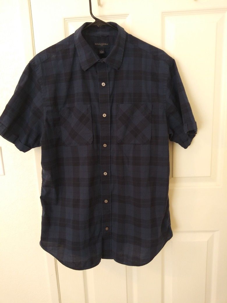 Men's Short Sleeve, Blue, Plaid "Banana Republic" Shirt. Size Is Large.