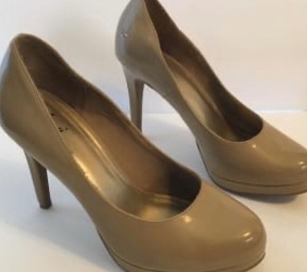 Fioni tan, nude stiletto platform patent leather pumps heel height 4”. Size 7.5w. In very good condition.