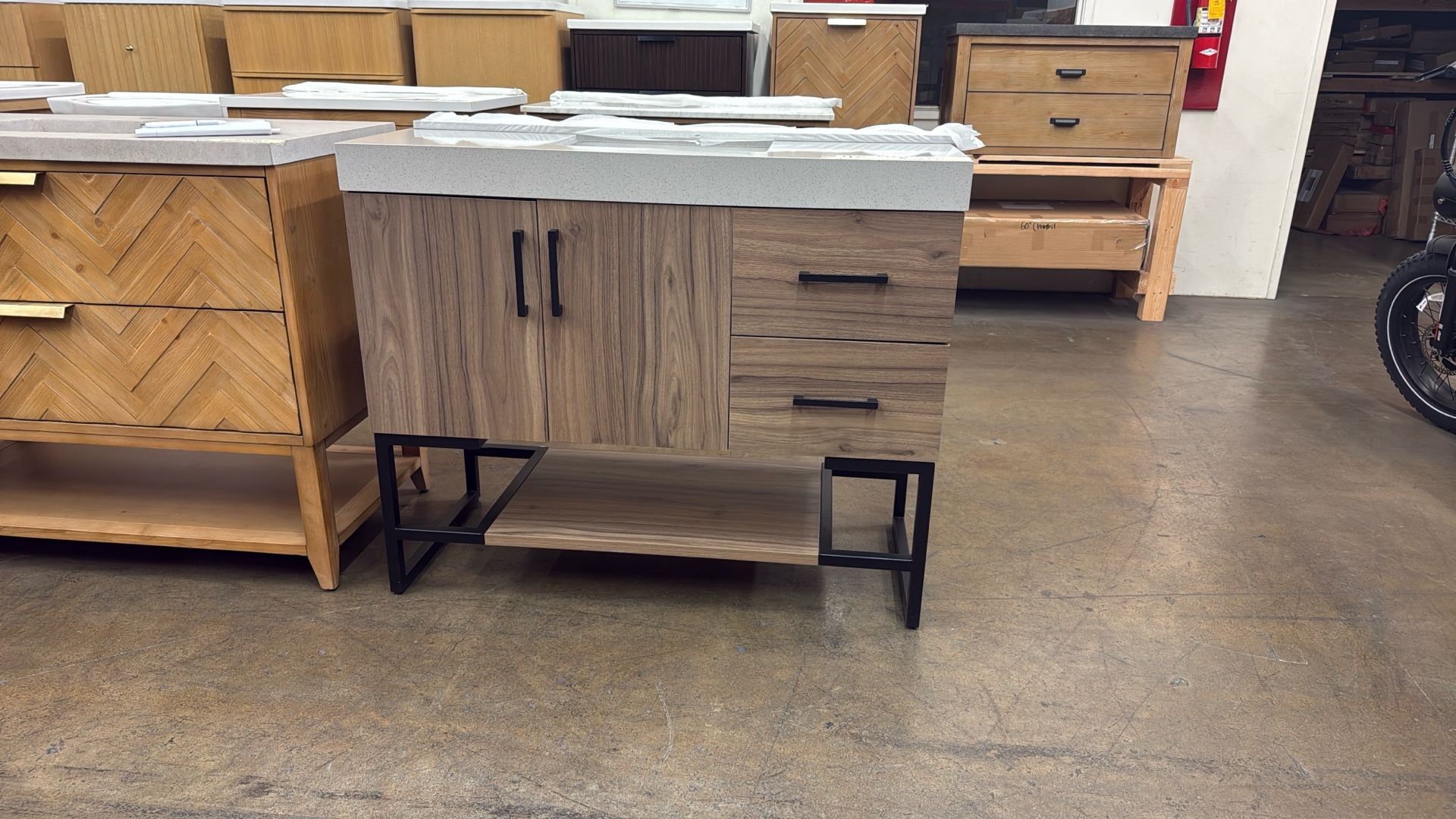 First come first serve! MDF Light gray quartz countertop with backsplash Undermount ceramic sink included Pre drill for one hole faucet Black hardware and frame legs Ari Kitchen and Bath 501 S State College Blvd Fullerton, Ca 92831 Monday - Friday 8am- 4pm Saturday schedule by appointment only