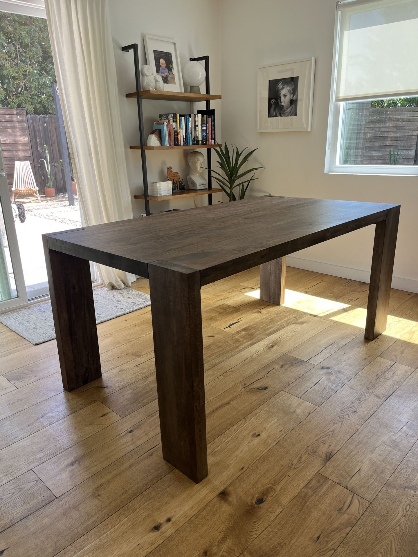 CB2 Blox dining table in excellent condition. One minor 1 inch scratch on one of the legs (shown in last pic). Table is amazing, easily can seat 6 people, and looks great with either modern, mid century modern, or boho design styles. Made of solid mango wood. Dimensions are: 29.5"H x 63"W x 35"D