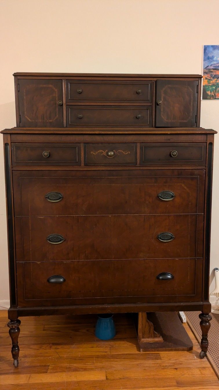 Antique, dark wood tone, wheeled, highboy bedroom dresser. Features eight dovetailed drawers, two cabinets, ten pieces of original brass hardware, and 3 contemporary. Good condition with light surface wear and a few veneer chips from prior use. Dimensions: Height: 4' 5" (58") Width: 3' 2" (38") Drawer & Cabinet Dimensions: (WxHxD) 2 Top Drawers: 16"x3"x15.5" 2 Cabinets: 8"x8.5"x16" 2 Side Drawers: 11"x3"x16.25" 1 Small Drawer: 8.5"x3"x16.25" 3 Bottom Drawers: 33.5"x6.5"x16.25" Pick up in Astoria near the Beer Garden.